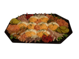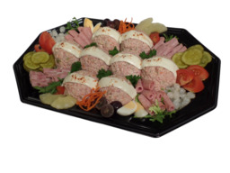 Salade is gegarneerd met diverse soorten fruit en ambachtelijke vleeswaren.