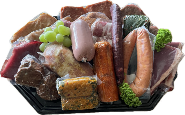 Inhoud: biefstuk, rundersaucijzen, kipschnitzel, cordon bleu, slavinken, varkenschnitzel, boomstammetjes, runderburgers, varkensschnitzel, beenham, rookworst, grillworst, leverworst, harde worst